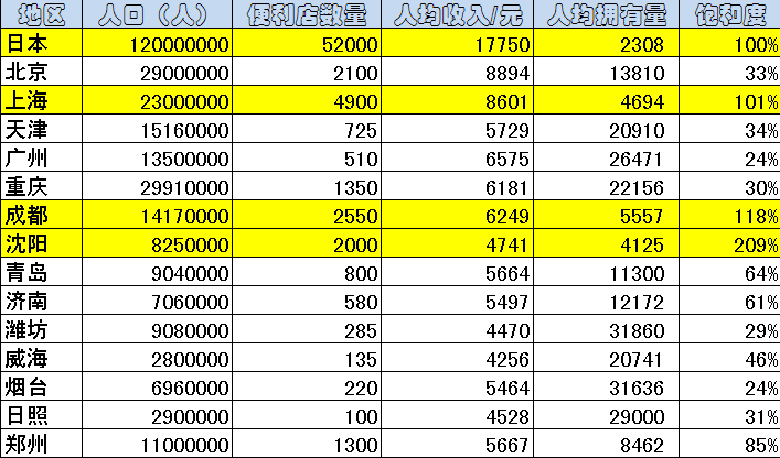 说明:此表根据人口、便利店数量、人均收入计算出人均便利店拥有量,以日本为标准值参照,算出25个一级、二级城市的便利店饱和度。