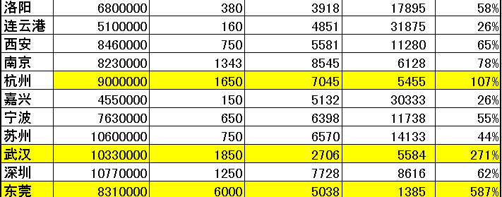 2、去掉东莞特殊地域性,各大城市的平均饱和度只有65%,而且只看二线、三线城市更低至48%。(数据其中可能还含有部分个体超市)